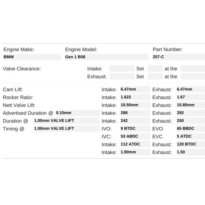 Stage 3 drag racing cams for professionally built B58 Gen 1 engines making 1200hp+. Turbo sizing 72mm+ on high boost. Fuel type ethanol blend or methanol. Must have valve spring upgrade